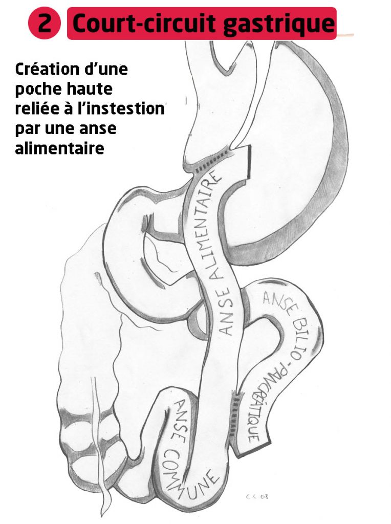 Technique restrictive et mal absorptive qui permet de diminuer à la fois la quantité d’aliments ingérés et l’assimilation de ces aliments par l’organisme, grâce à un court-circuit d’une partie de l’estomac et de l’intestin. Les aliments vont directement dans la partie moyenne de l’intestin grêle et sont donc assimilés en moindre quantité.