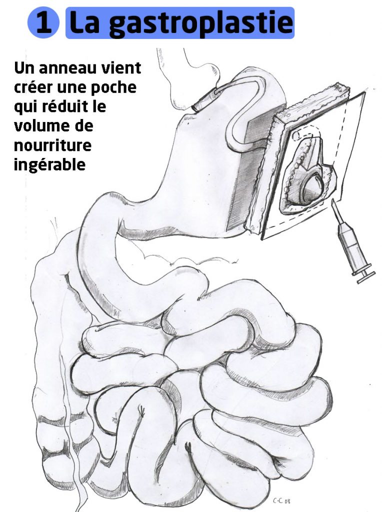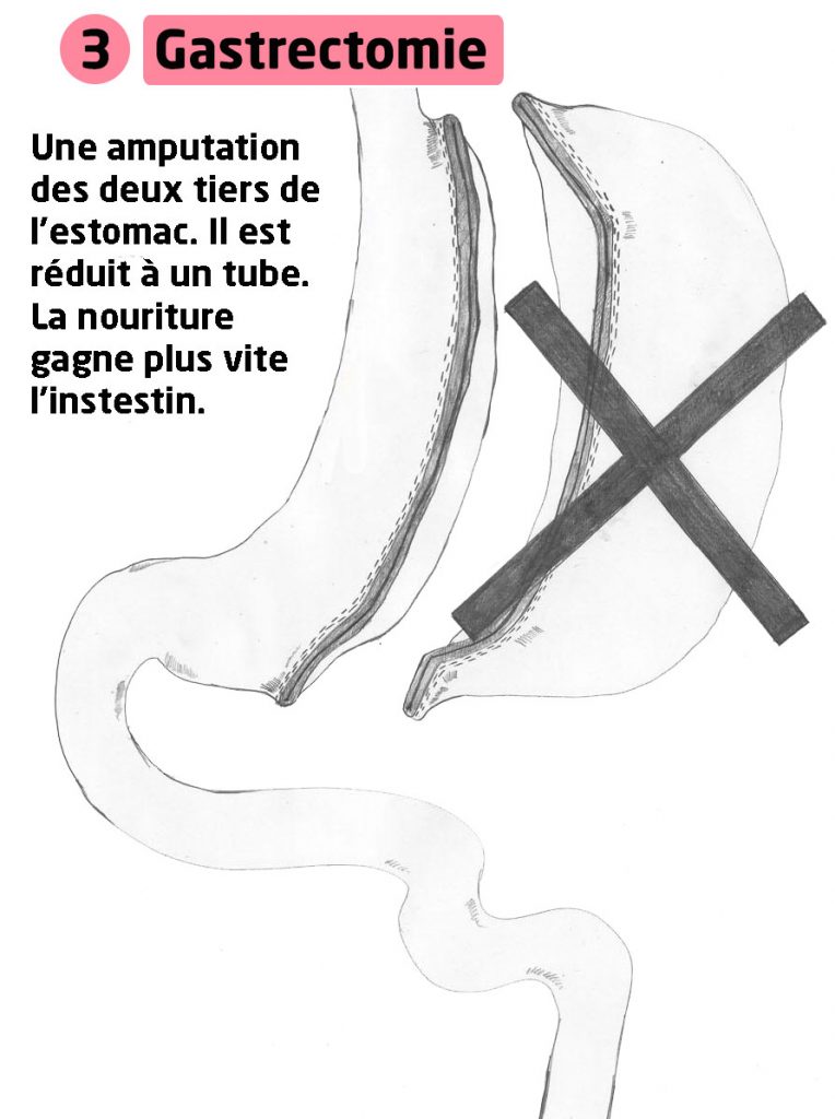 L’estomac est réduit à un tube vertical et les aliments passent rapidement dans l’intestin. En outre, l’appétit est diminué. Cette technique ne perturbe pas la digestion des aliments.